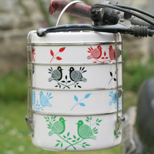These stunning hand-painted stainless steel tiffins are practical and stylish picnic or camping accessories. The tiffins have been hand-painted with a delicate birds and flowers pattern and are made up of 4 compartments with 4 stainless steel plates. These tiffins match the other items in our range of stainless steel picnic ware. They can be used to store cakes and biscuits, picnic food and as pretty serving bowls and plates. They are available in 2 colour options; multicoloured (navy, red, light blue and green) or cream (with green, blue, black and red) - search for other option. Food safe. Hand wash only. 21cm x 21cm x 25cm.